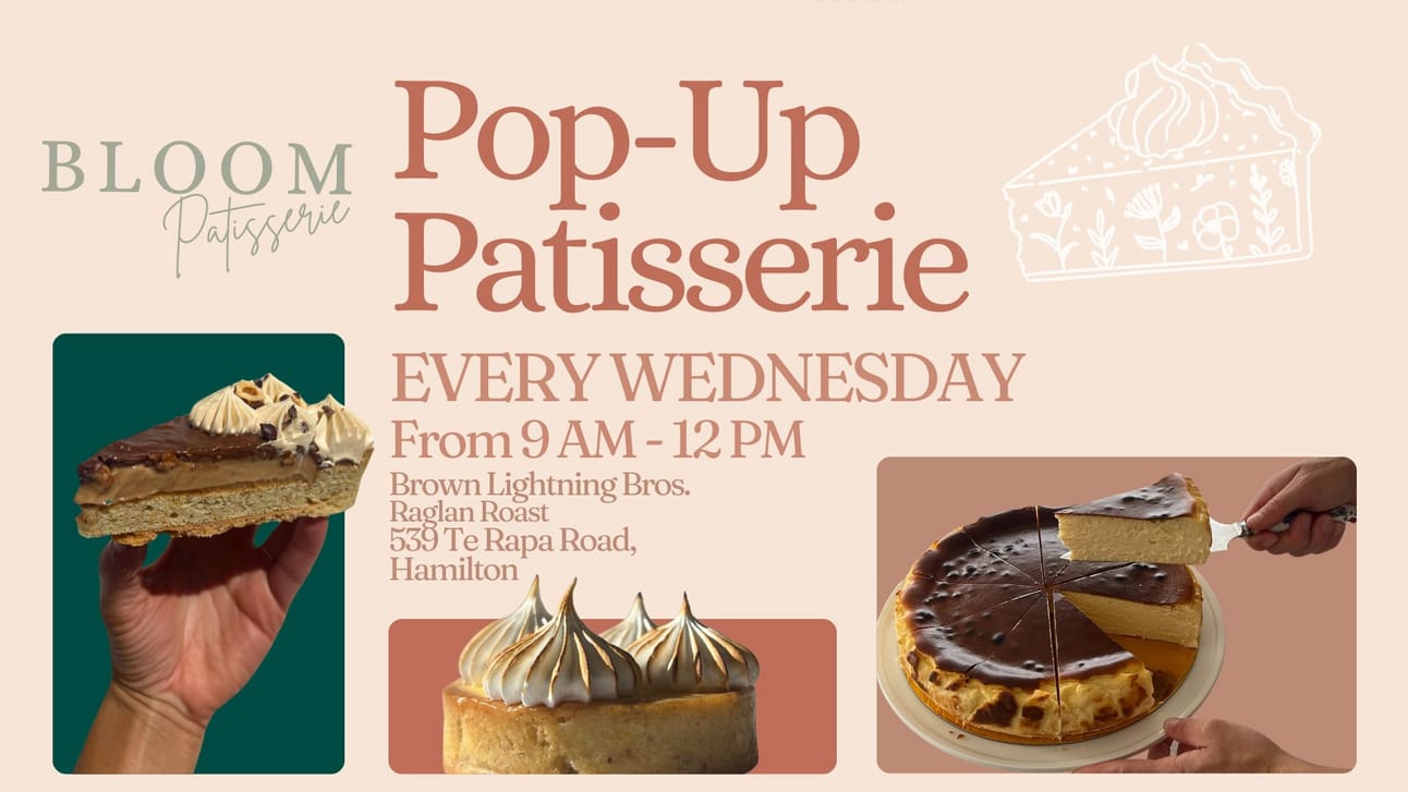 Pop Up French Patisserie | Wed 18th 9:00am-noon at Brown Lightening Bros. Looking for a little something sweet to accompany your coffee or a delicious French treat to brighten your lunch break? Bloom Pâtisserie is popping up every Wednesday at Brown Lightning Bros, Raglan Roast Te Rapa! Info.