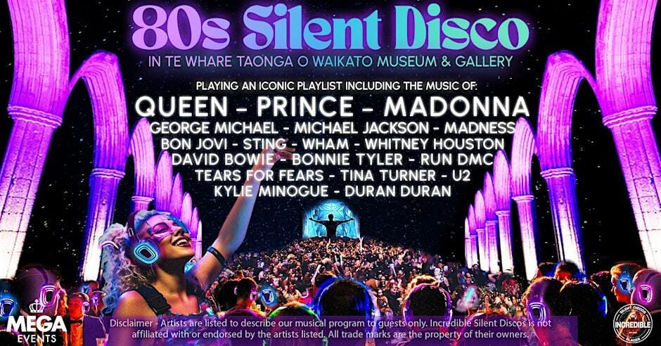 80s Silent Disco | Fri 22nd 6:30pm and 9:30pm at Waikato Museum. After selling out over 100 shows across the world, Silent Discos in Incredible Places are heading to Hamilton! Expect 3 epic DJs playing all your favourite 80s tunes in the stunning, illuminated surroundings of the Waikato Museum. Tickets.Â
