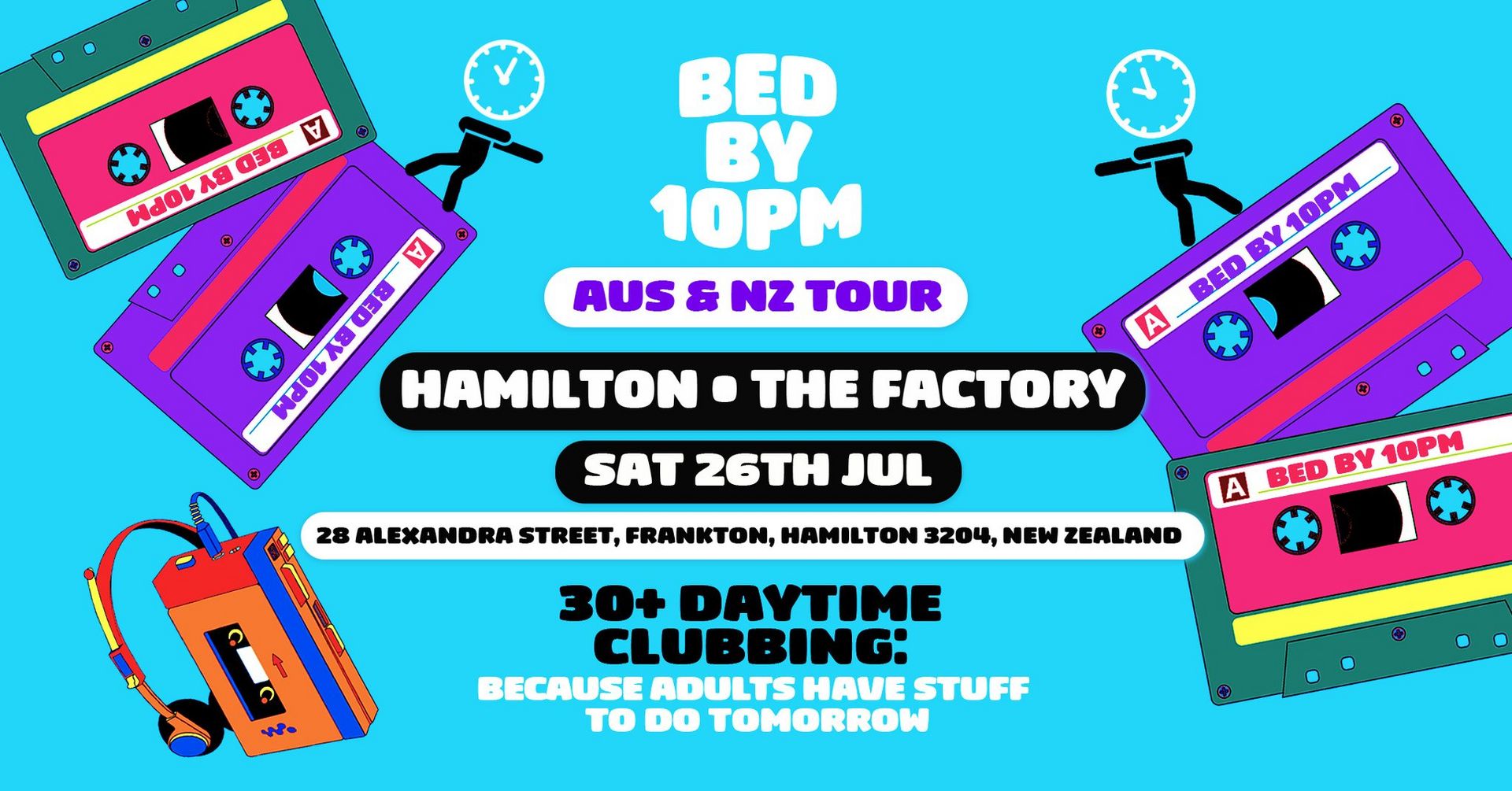 Bed By 10 | Sat 26th 4:00 - 9:00pm at The Factory. Bed By 10 is a chance for ravers over 30 to relive the peak of the 80s, 90s & early 2000s clubbing scene! Expect crazy visuals, confetti showers, CO2 cannons and more! Tickets.